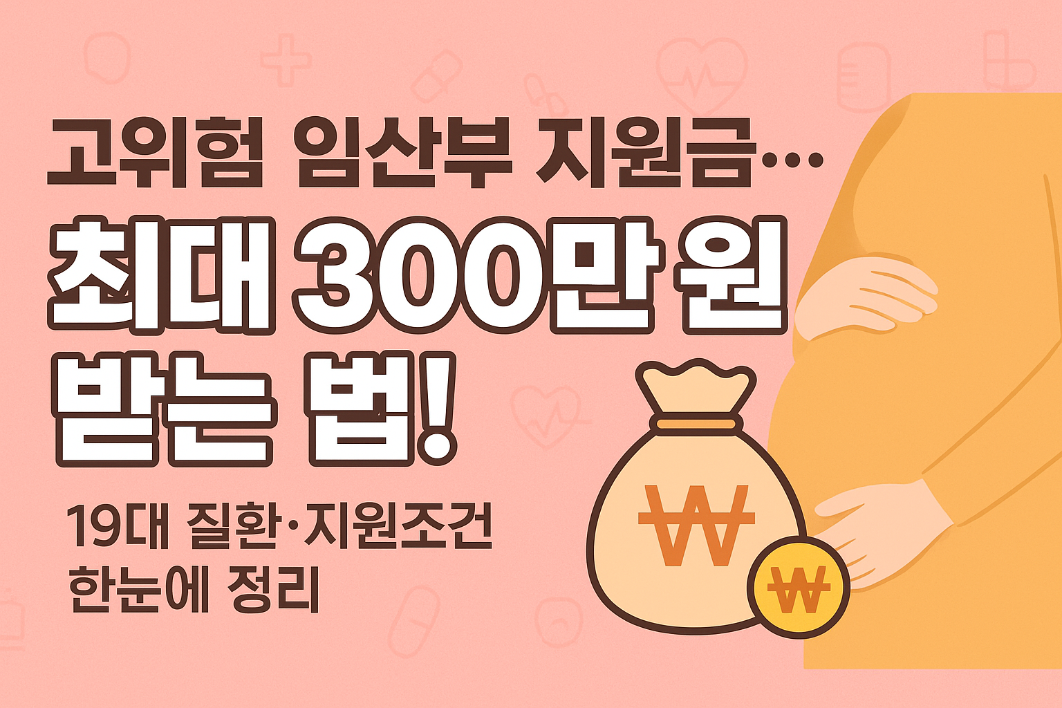 가장 먼저 내가 지원 대상인지 확인해야겠죠? 고위험 임산부 의료비 지원 사업은 19대 고위험 임신 질환으로 진단받고 입원 치료를 받은 임산부를 대상으로 합니다. 예전에는 소득 기준(중위소득 180% 이하 등)이 있었지만, 2024년부터는 소득과 상관없이 지원받을 수 있게 확대되었습니다! (정말 반가운 소식이죠? 🎉)