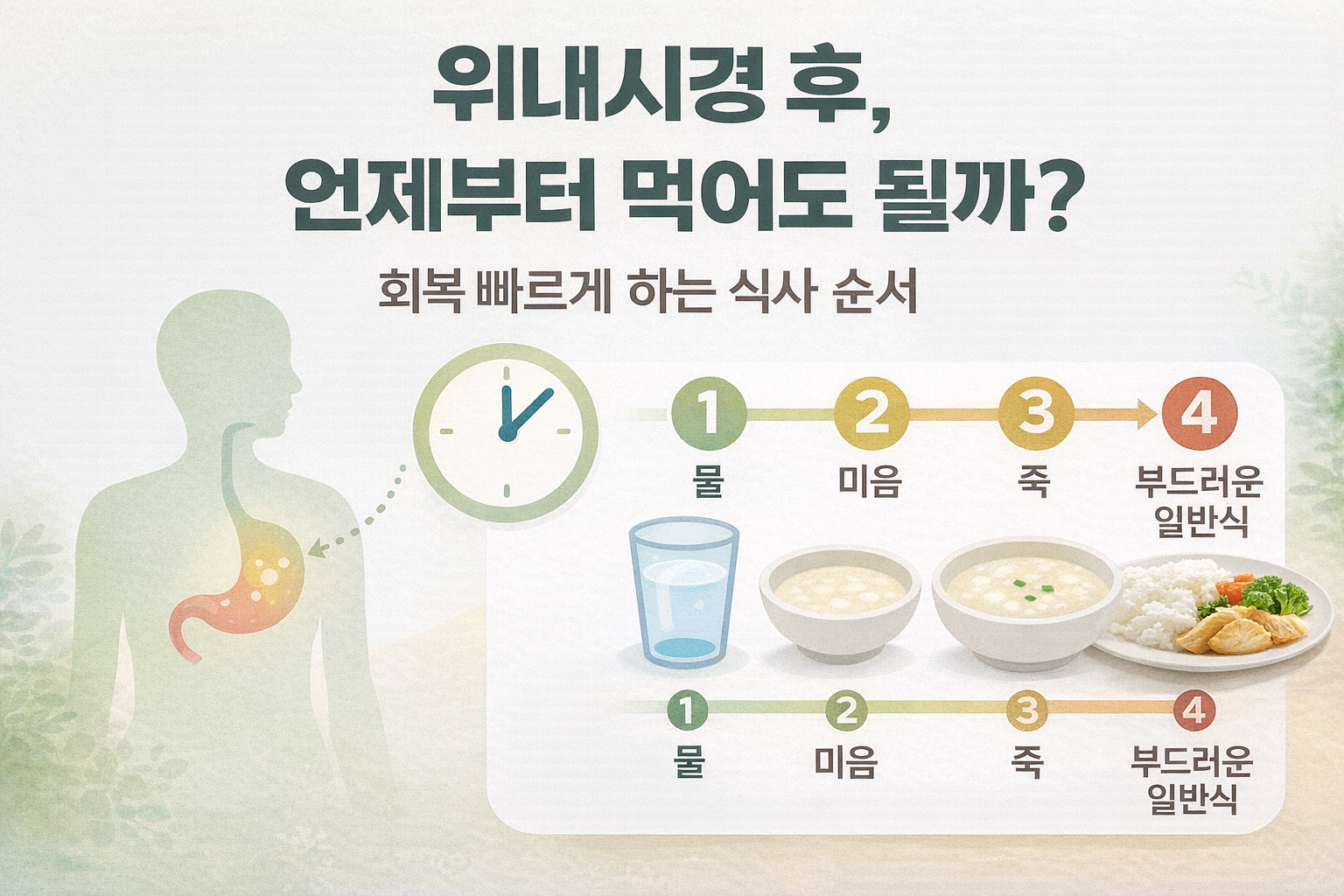 - 3단계: 부드러운 식사 (당일 저녁~다음 날): 흰쌀밥, 순한 국, 두부, 계란찜 등 **부드러운 일반식**으로 조심스럽게 돌아갑니다.