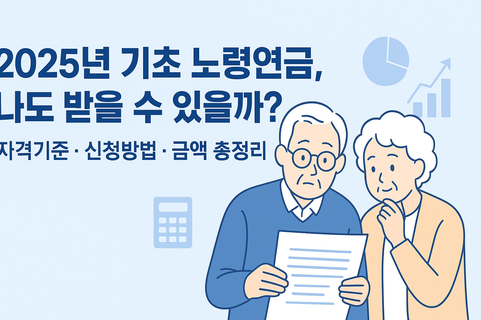 ✨ 핵심 조건: 만 65세 이상, 국내 거주, 소득 하위 70% 어르신 대상입니다.📊 2025년 지급액: 단독가구 최대 35만 원, 부부가구 최대 56만 원을 매월 지급받아요.🧮 자격 확인:'복지로' 홈페이지에서 모의계산으로 미리 확인 가능!👩💻 신청 방법: 주민센터, 국민연금공단 방문 또는 온라인 '복지로'에서 간편하게 신청하세요.자주 묻는 질문 ❓