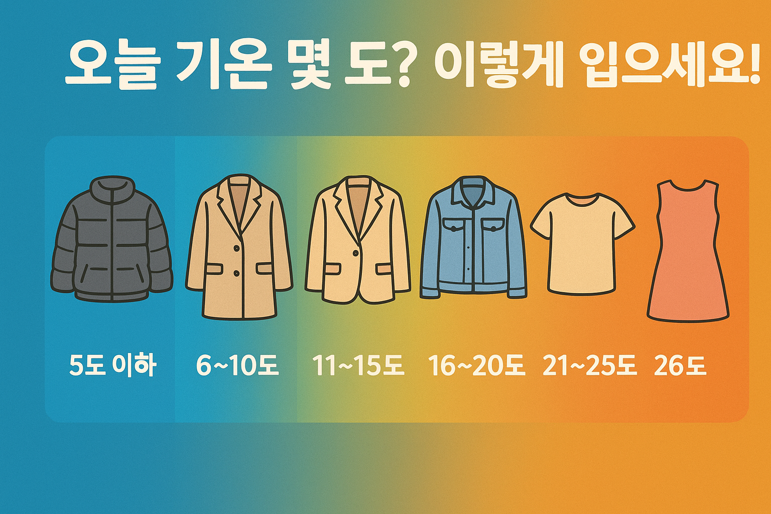 ✨ 5℃ 이하: 패딩, 내복, 방한용품 필수! 완전무장으로 체온을 지켜주세요.📊 6℃ ~ 15℃: 코트와 자켓의 계절! 여러 겹 레이어드해서 멋과 보온을 동시에!🧮 16℃ ~ 25℃: 긴팔, 셔츠, 가디건! 낮에는 가볍게, 저녁엔 얇은 외투를 준비하세요.👩💻 26℃ 이상:반팔, 반바지, 원피스 등 시원하고 통풍 잘되는 옷이 최고!마무리: 똑똑한 옷차림으로 사계절 나기 📝