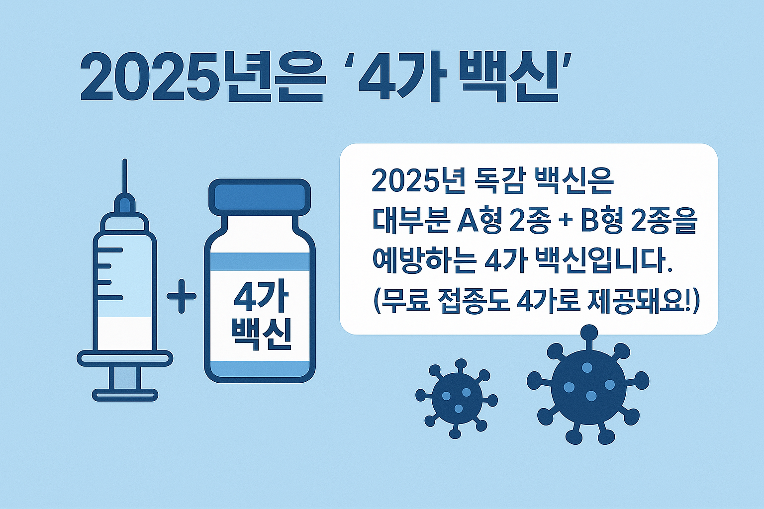 2025년 독감 백신은 대부분 A형 2종 + B형 2종을 예방하는 4가 백신입니다. (무료 접종도 4가로 제공돼요!) 올해는 변이 바이러스가 보고되어, 전문가들은 예방 범위가 넓은 4가 백신 접종이 필수적이라고 보고 있습니다.