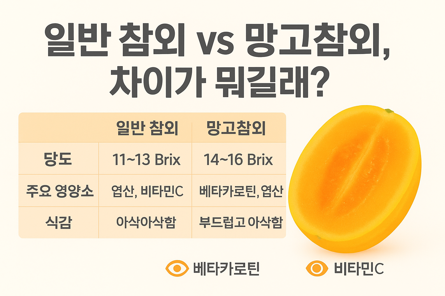 구분 일반 참외 망고 참외 과육 색상 흰색 주황색 (망고색) 평균 당도 11 ~ 13 Brix 14 ~ 16 Brix 주요 영양소 엽산, 비타민C 베타카로틴, 엽산 식감 아삭아삭함 부드럽고 아삭함 표에서 보시는 것처럼 당도가 확실히 높아요. 베타카로틴은 항산화 작용을 도와 노화 방지와 눈 건강에 좋다는 사실, 다들 아시죠? 😉