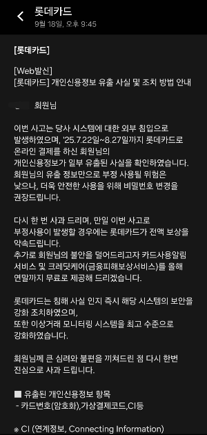 가장 중요한 것은 "이번 해킹으로 인한 금전적 피해는 100% 보상한다"는 점입니다. 만약 의심스러운 결제 내역이 발견되면 즉시 롯데카드 고객센터로 신고하세요!