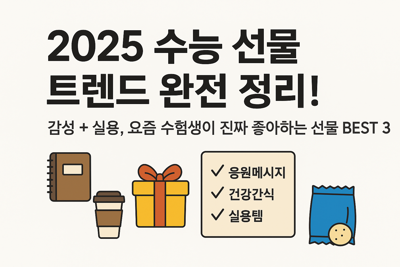 2025년 수능 선물 트렌드는 명확합니다. 수험생에게 실질적인 도움이 되는 '실용성'과 지친 마음을 다독여주는 '감성', 이 두 마리 토끼를 잡는 것이 중요해요. 아래 핵심 요약 카드로 다시 한번 정리해 드릴게요!